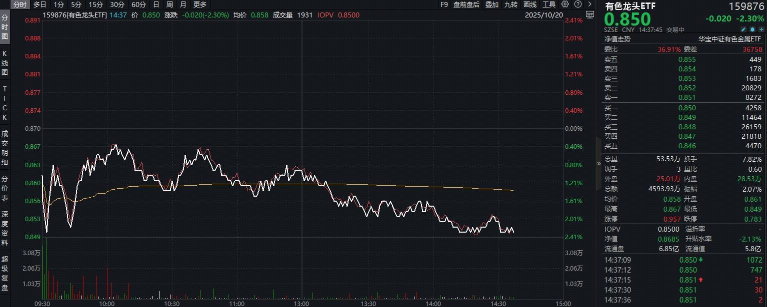 或由于中美贸易摩擦缓和,叠加俄乌地缘局势取得进展,避险情绪缓解,此前迭创新高的金价跳水,失守4300美元/盎司关口MOM操盘网,映射到A股,今日(10月20日)黄金股领跌,揽尽有色金属行业龙头的有色龙头ETF(159876)深陷水面以下,场内价格现跌2.3%。