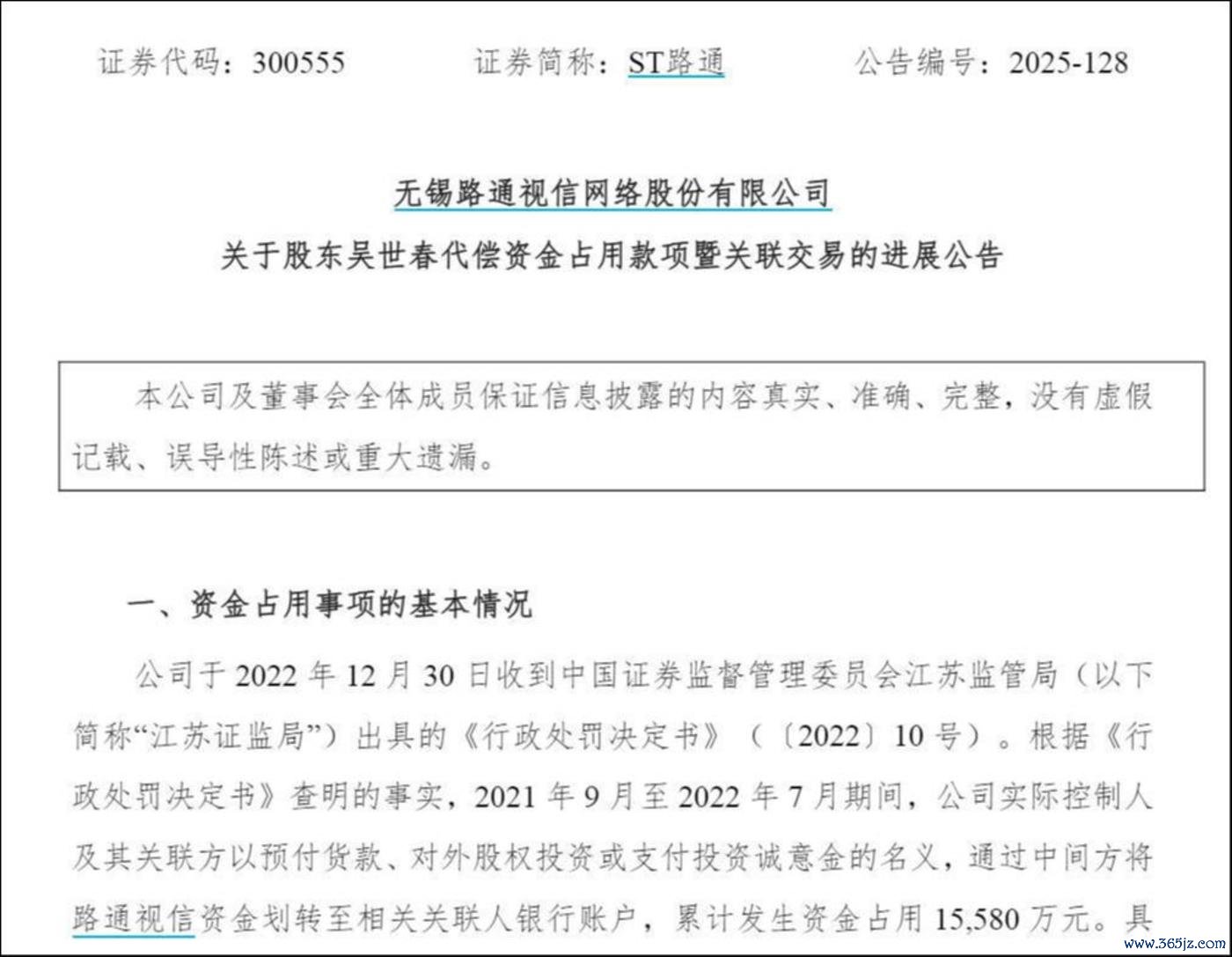 回溯历史,2021年9月至2022年7月,公司实际控制人及其关联方累计发生资金占用1.55亿元。最终,因未能在一个月内解决资金占用问题,ST路通股票于2023年2月1日起被实施其他风险警示。